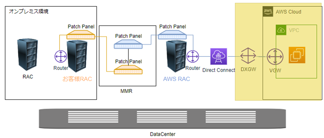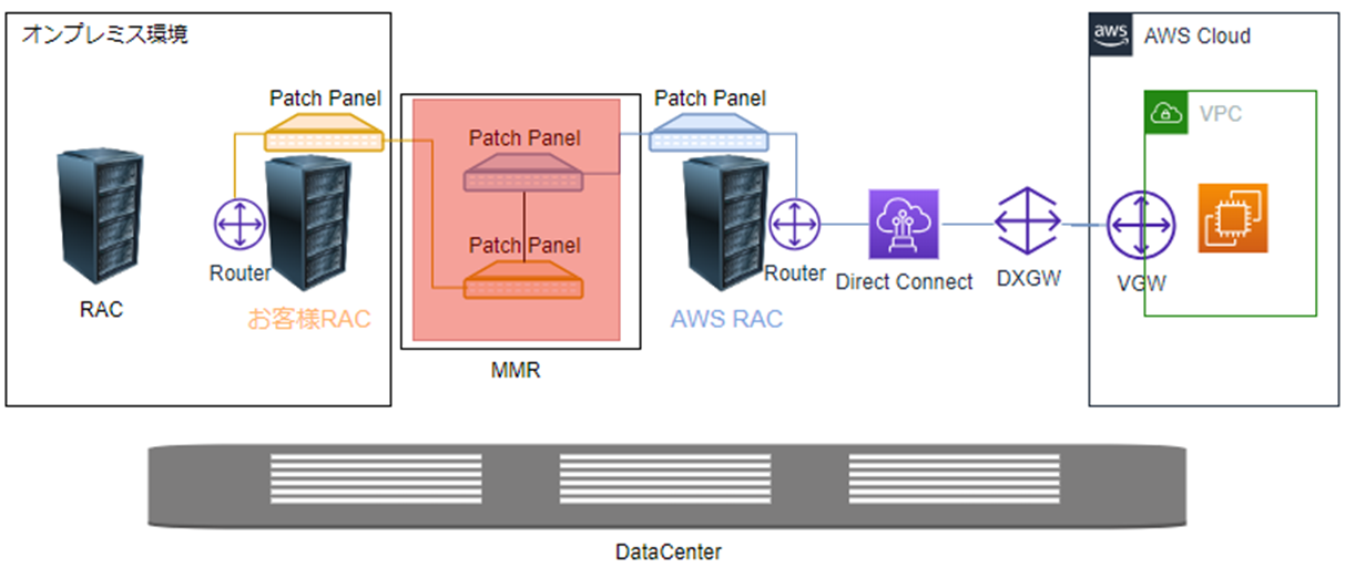同じく、薄紫を囲った部分は、AWS側のラックからパッチパネル経由でMMRにあるパッチパネルと物理ケーブルで接続する。